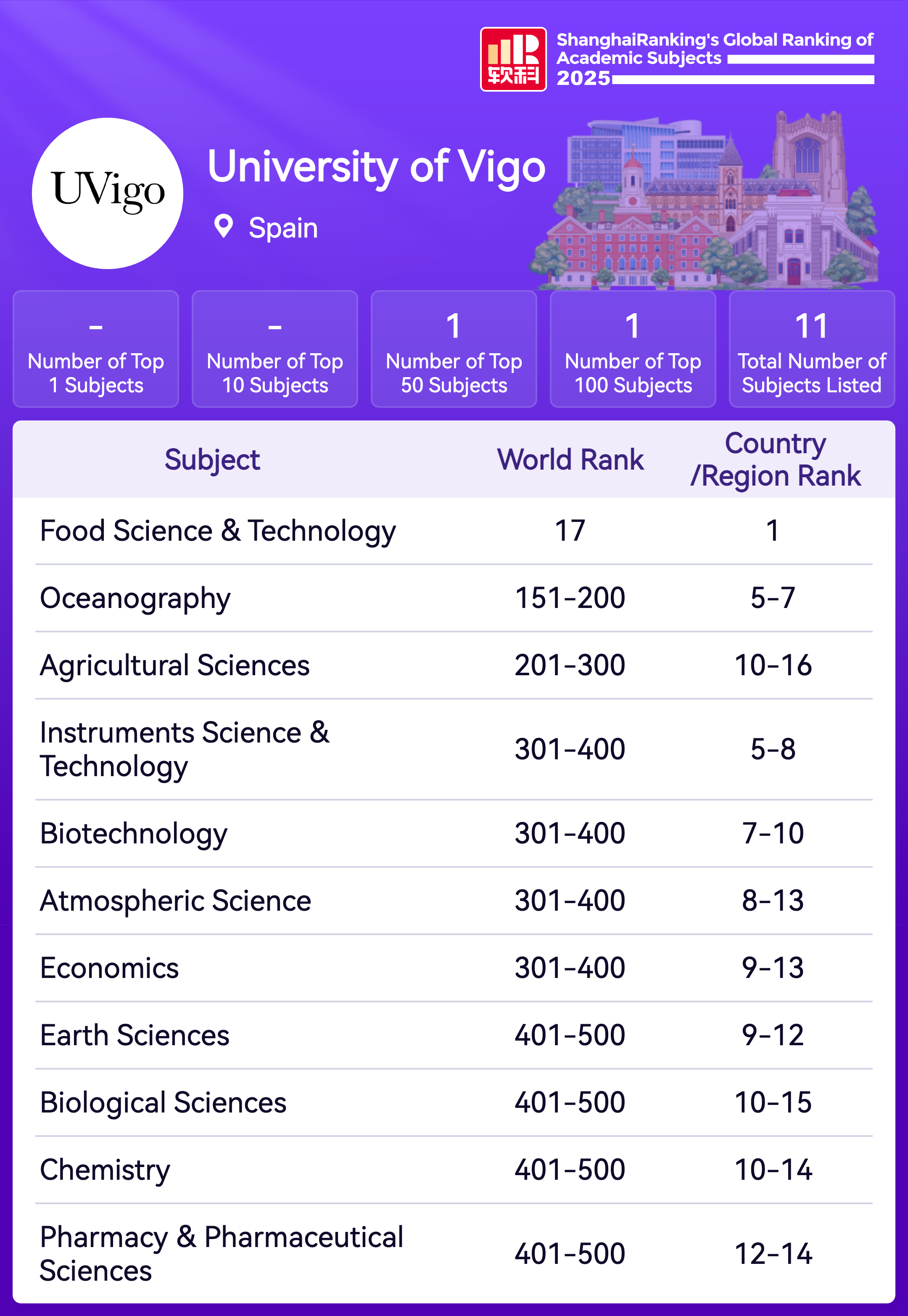 A Shanghai Ranking Consultancy, responsable do ránking ARWU (máis coñecido como ránking de Shanghai), acaba de facer público o seu Global Ranking of Academic Subjects (GRAS) 2025, a clasificación das mellores universidades do mundo en 57 materias de investigación. Nel, a Universidade de Vigo mantense como primeira universidade española en Ciencia e Tecnoloxía dos Alimentos e sube ao posto 17. Este resultado mantena como universidade de referencia en España nesta materia. En Oceanografía, está entre as 200 mellores (no traballo 151-200) e en Ciencias Agrícolas entre as 300 (no tramo 201-300). Noutras catro materias, a UVigo posiciónase entre as 400 institucións de educación superior referentes internacionalmente, é dicir no tramo 301-400. Trátase de Ciencias Atmosféricas, Biotecnoloxía, Ciencias Económicas e Ciencia e Tecnoloxía dos Instrumentos. Por último, a UVigo sitúase entre as 500 universidades do mundo (tramo 401-500) en Química, Ciencias da Terra, Farmacia e Ciencias Farmacéuticas e Ciencias Biolóxicas. Dez dos ámbitos repiten de edición 2024 do ránking e incorpórase como novidade Ciencias Biolóxicas.